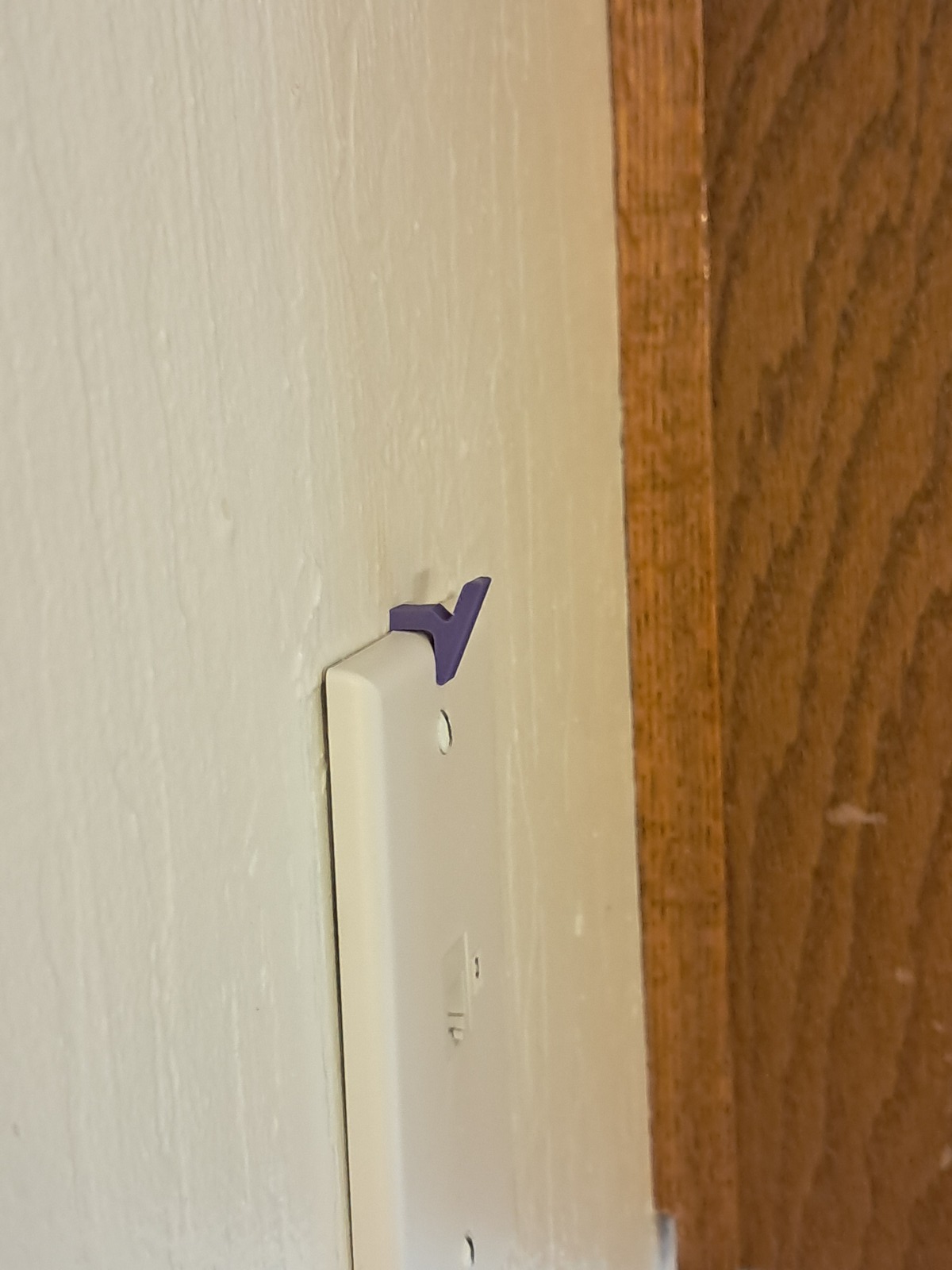I decided to hang it up in the kitchen to cover an old telephone jack. But I needed a hook somehow. So I quickly designed and printed a hook to slip behind the wall plate and held in place by the screw. 3D printers are super handy for those little things that otherwise don’t exist.