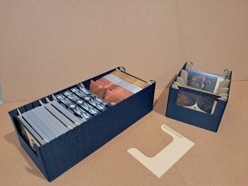 Since the game group I got together chose to play Kinfire Chronicles I decided I needed to redesign the card holder boxes. Especially since, after resetting the game to start fresh, one section of cards didn’t fit at all anymore in my original design. I know a deck of cards will take up more space once it’s been handled for a bit as the cards take on a little warping, but I wouldn’t have thought it would be as pronounced as it was.